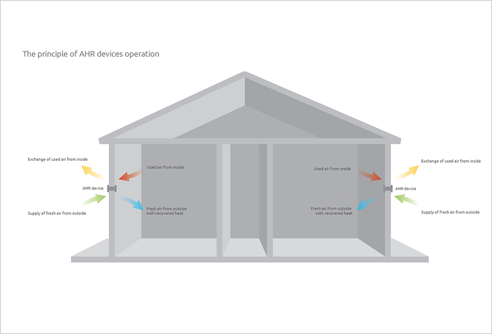 The main function of the AHR160 device is to ensure air exchange in the room while reducing heat loss. The recovery of heat lost in the ventilation process is possible thanks to the use of a ceramic accumulation exchanger, which retains and accumulates thermal energy and then warms the cooler air supplied from the outside. If the supplied air has a higher temperature than that in the room, the exchanger will lower it using the temperature of extracted air.