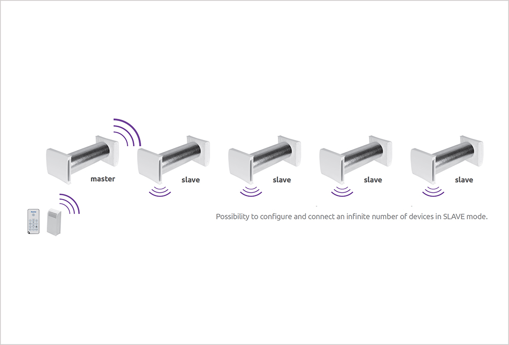 AHR160 has the ability to connect several devices installed in one or more rooms with the possibility of pairing them via wireless communication. No hassle of connecting devices with a power cord. Connection possible in various modes, e.g. both units only supply or only exhaust and alternate operation, one unit blows in and the other blows out.