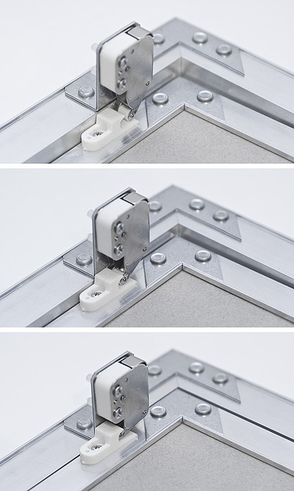 Wykonane z aluminiowych profili oraz wodoodpornej płyty klapy o grubości 12,5 mm, są wyposażone w zatrzaski sprężynowe typu mini-latch, dzięki którym otwieranie i zamykanie skrzydła odbywa się po jego dociśnięciu. Front klapy wykonanej z płyty kartonowo gipsowej, umożliwia pokrycie jej farbą, dzięki czemu otwór rewizyjny dyskretnie wpisuje się w estetykę pomieszczenia. Klapy występują w ponad 20 rozmiarach od 150 x 150 mm aż do 600 x 600 mm.